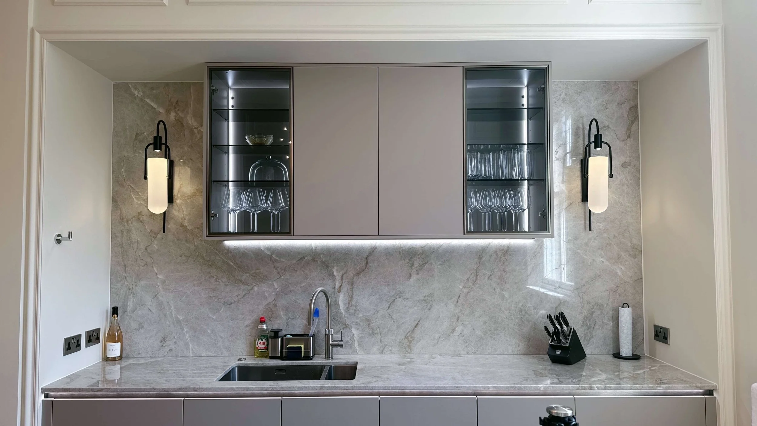 Glass-fronted cabinets are making a stylish comeback, and this time, they’re far from traditional. Smoked glass, in particular, has become a favourite for 2026. It’s elegant, modern, and brings a beautiful sense of depth to a kitchen.