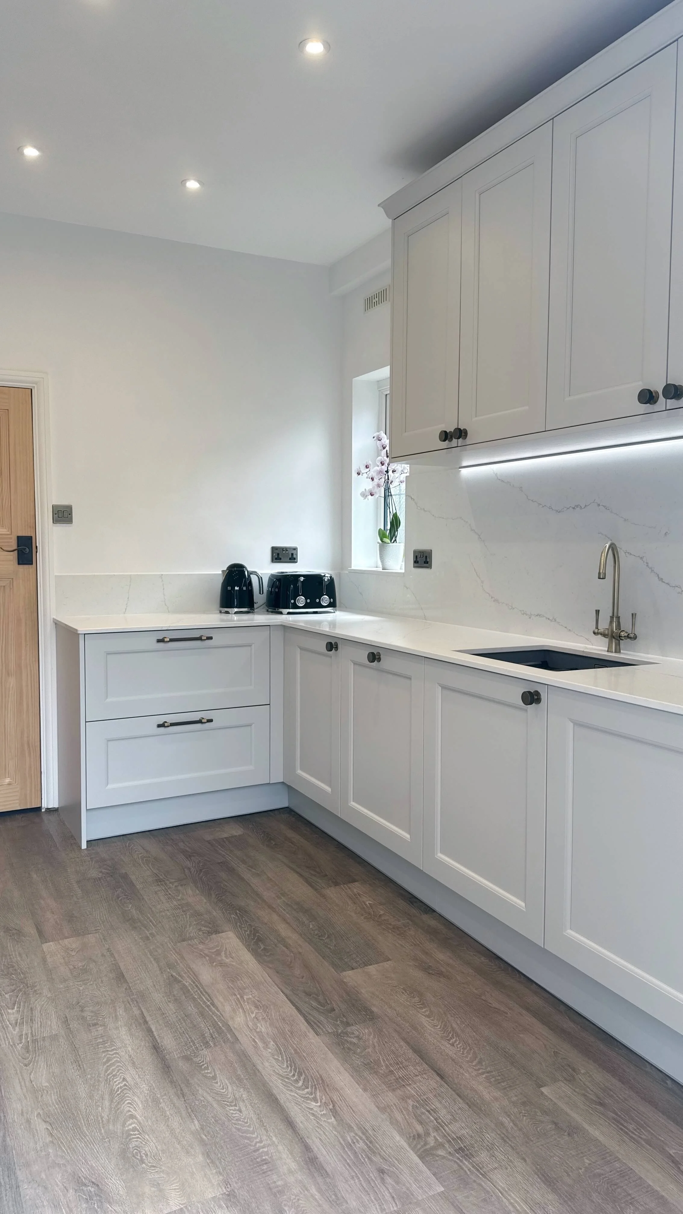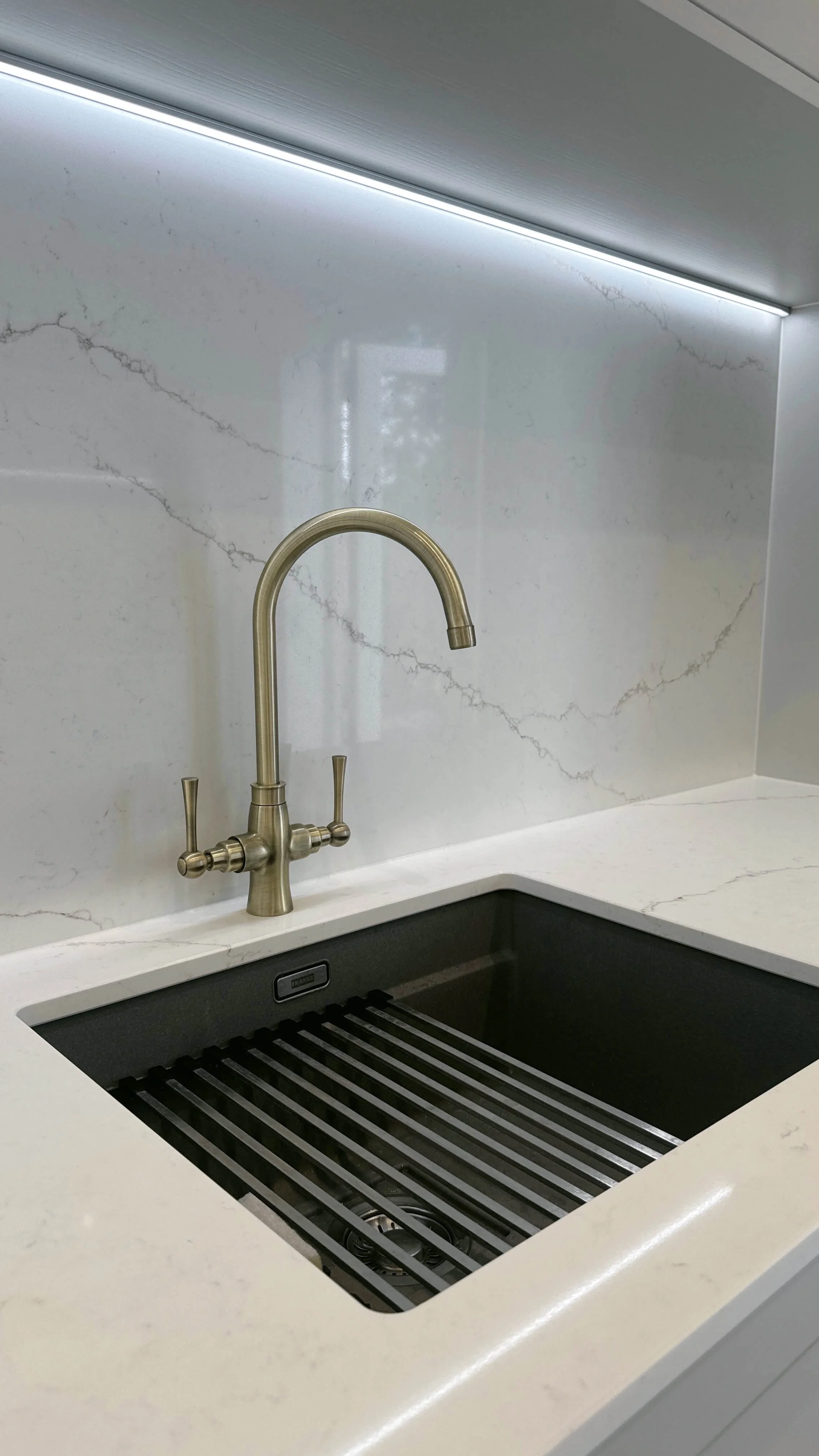 The worktops are Artscut Golden Venato, offering a luxurious marble-inspired look with delicate veining that adds depth and sophistication to the scheme. This surface is durable as well as elegant, making it a practical choice for everyday use.