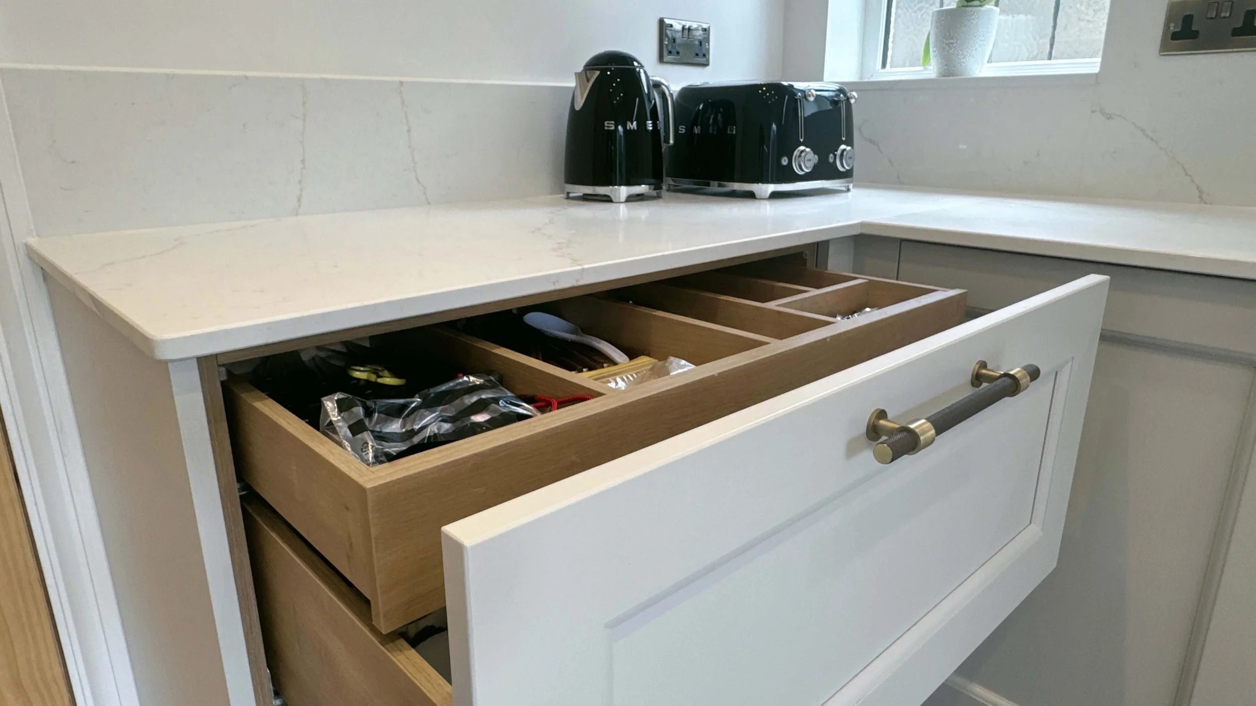 Clever storage solutions are woven throughout the design, including deep drawers with dividers and an array of concealed spaces for effortless organisation. A brass-finished tap ties in perfectly with the handles, creating a cohesive and stylish finish.