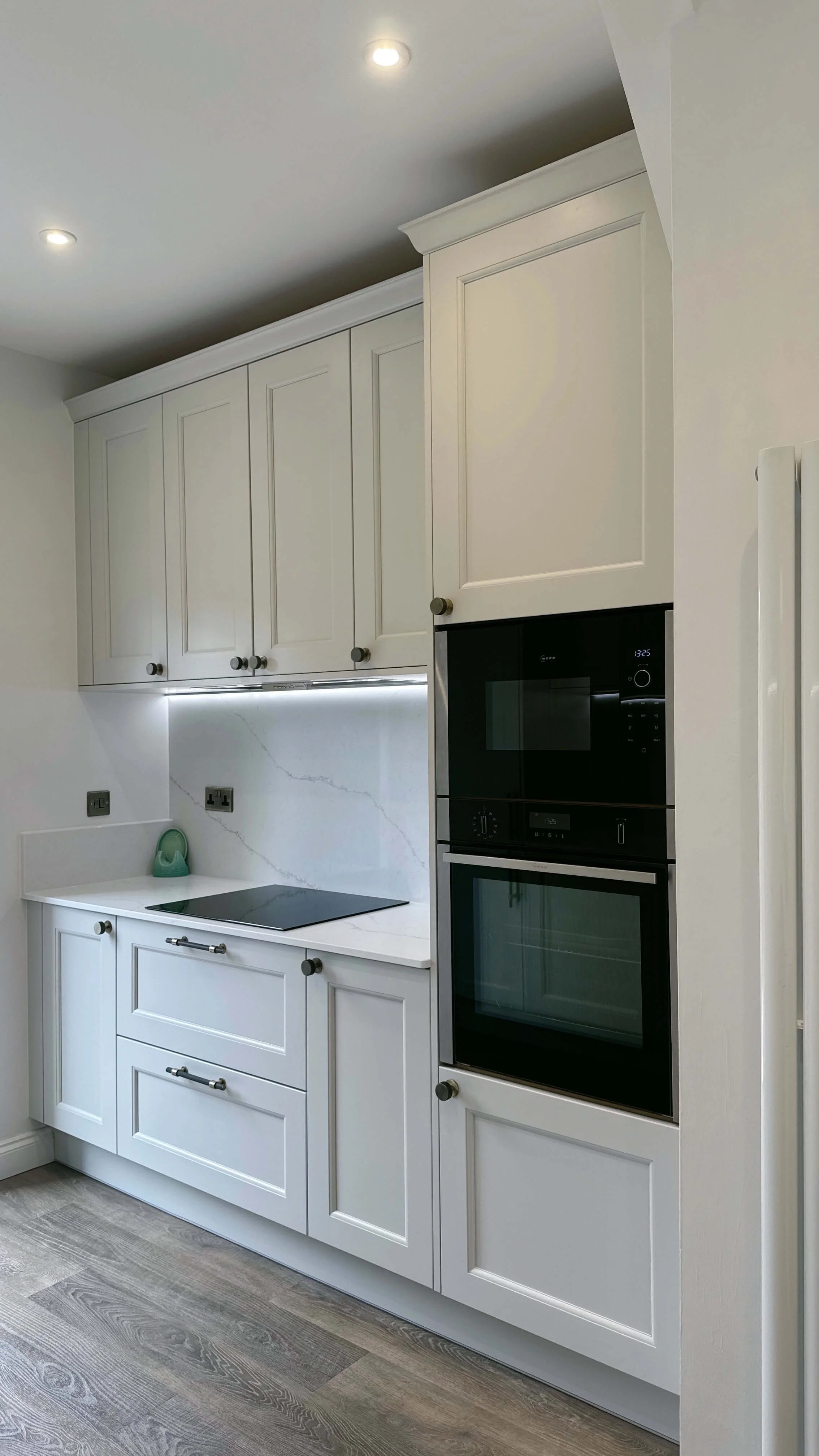 This elegant Shaker-style kitchen in London blends timeless design with modern functionality, resulting in a bright and welcoming space that feels both classic and contemporary.